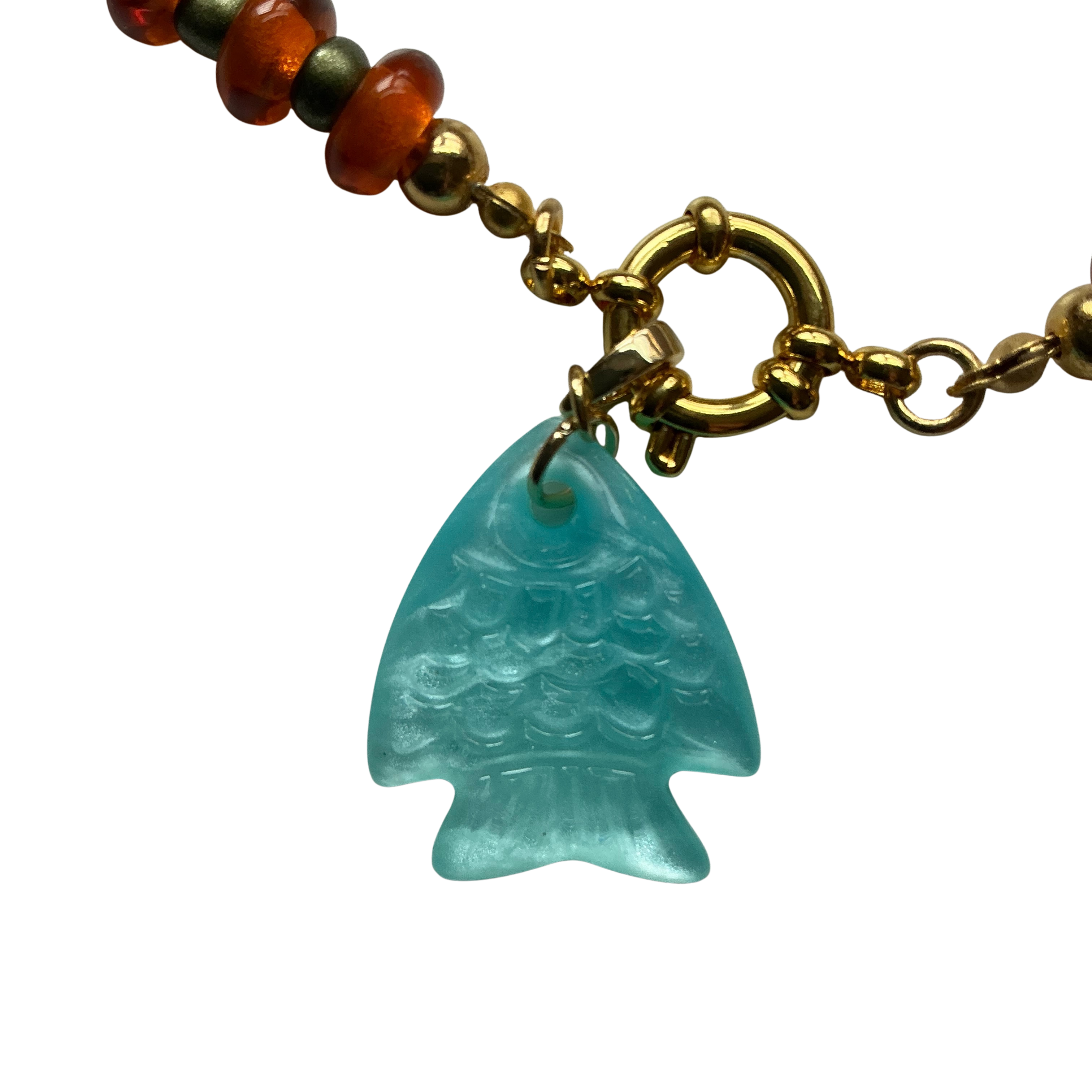 Collar artesanal con colgante de pez azul hecho a mano. Una joya original y simbólica, ideal para regalar o llevar como amuleto personal.