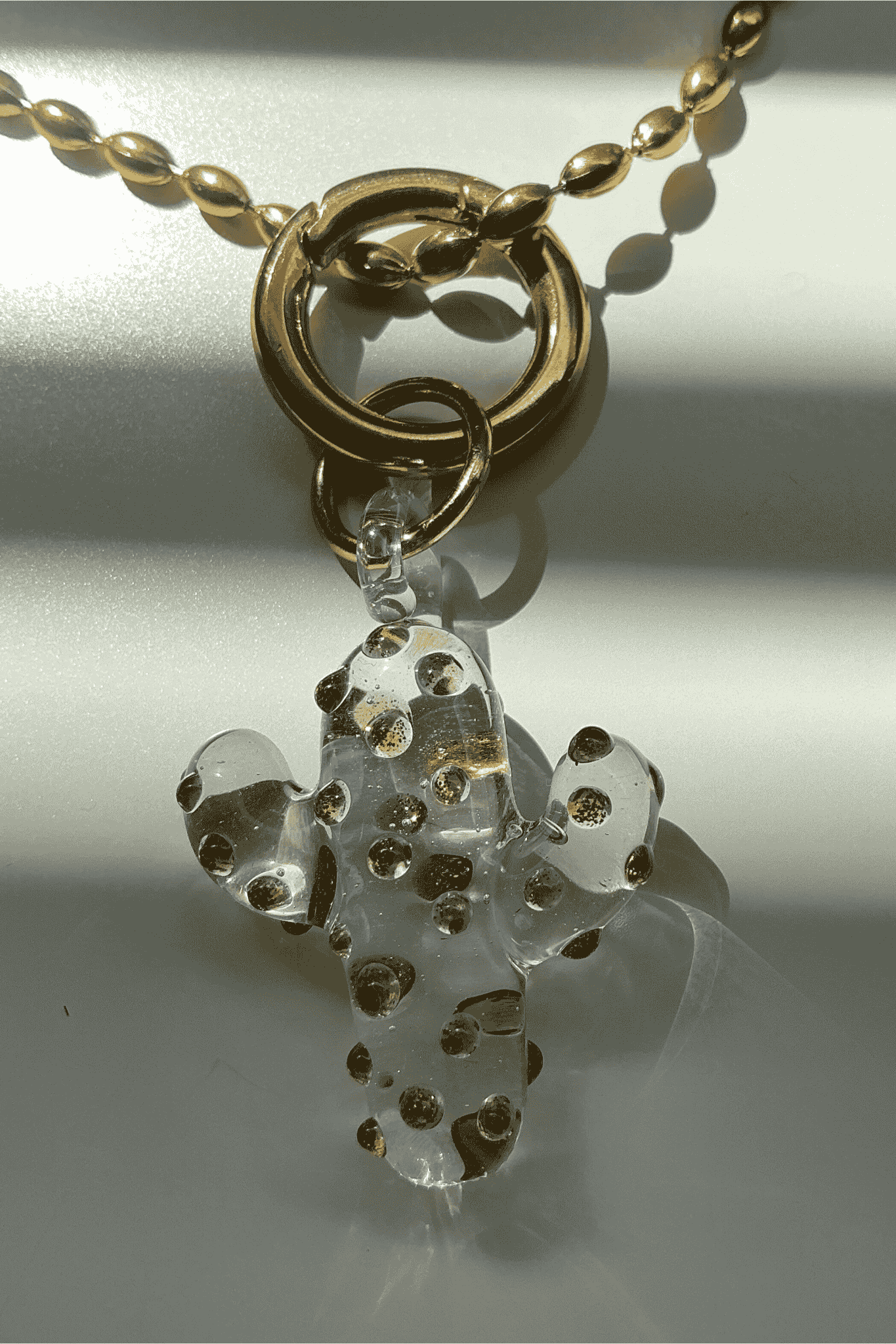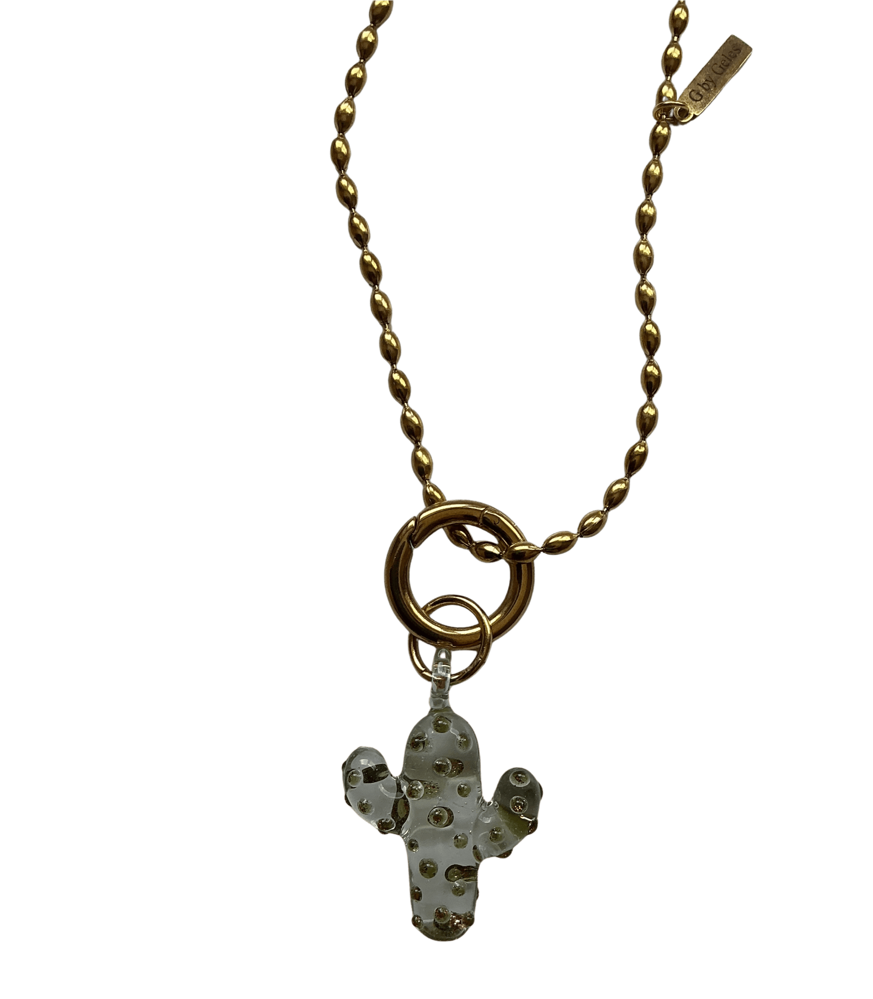 Collar artesanal con colgante de cactus de cristal y cadena dorada de acero inoxidable. Elegante, moderno y perfecto como regalo o accesorio diario.