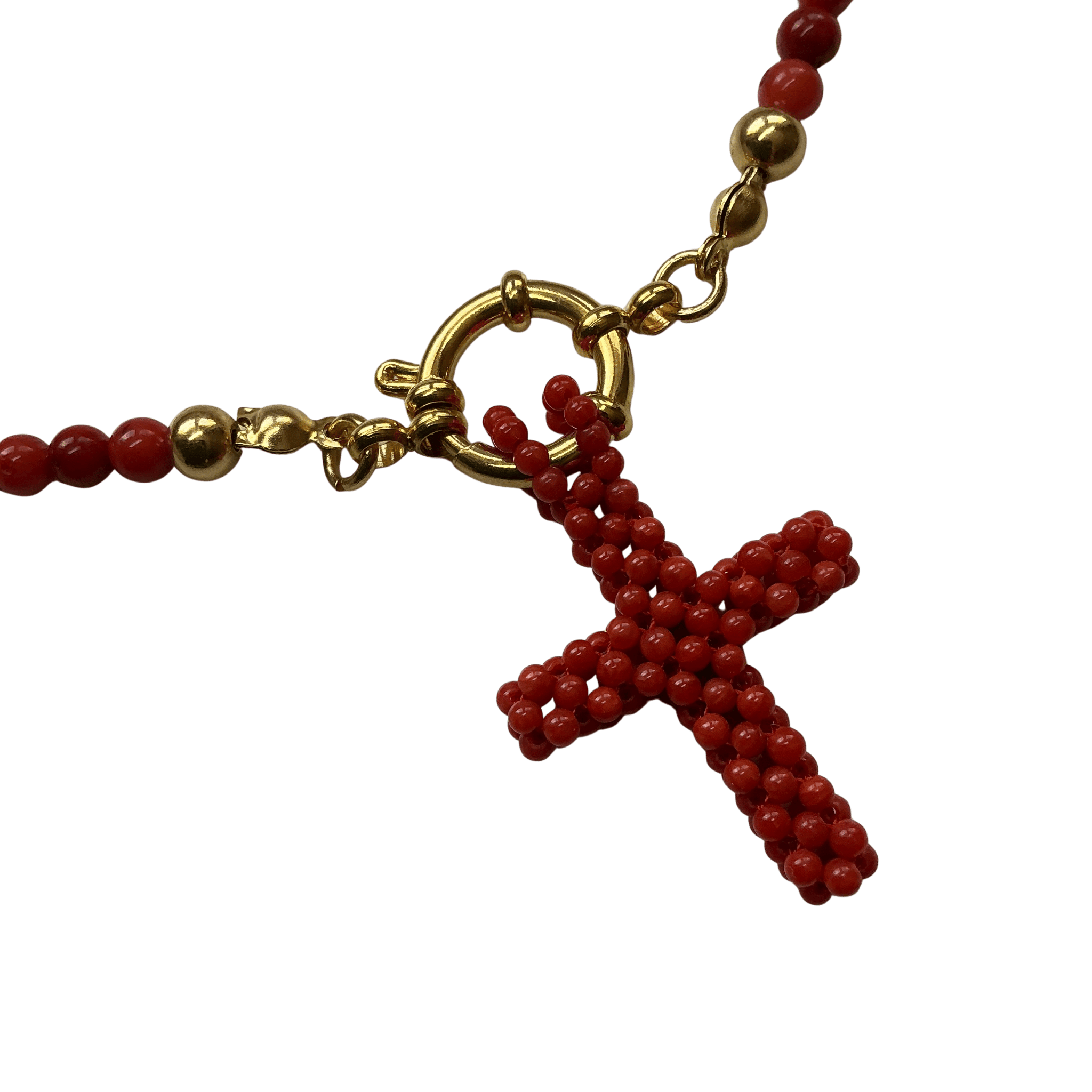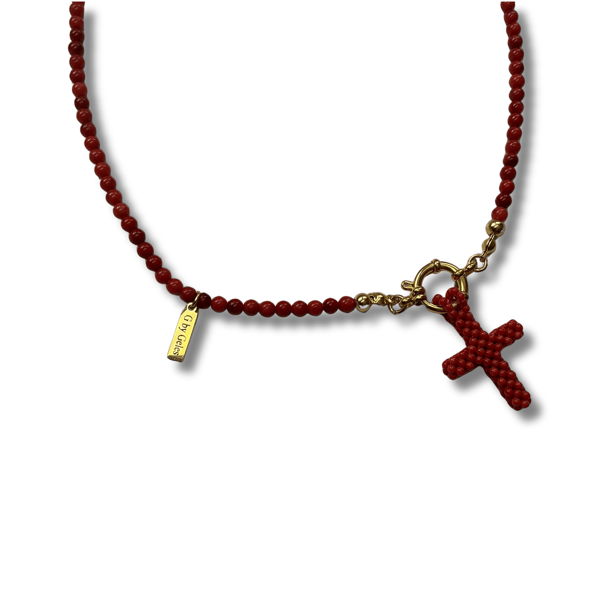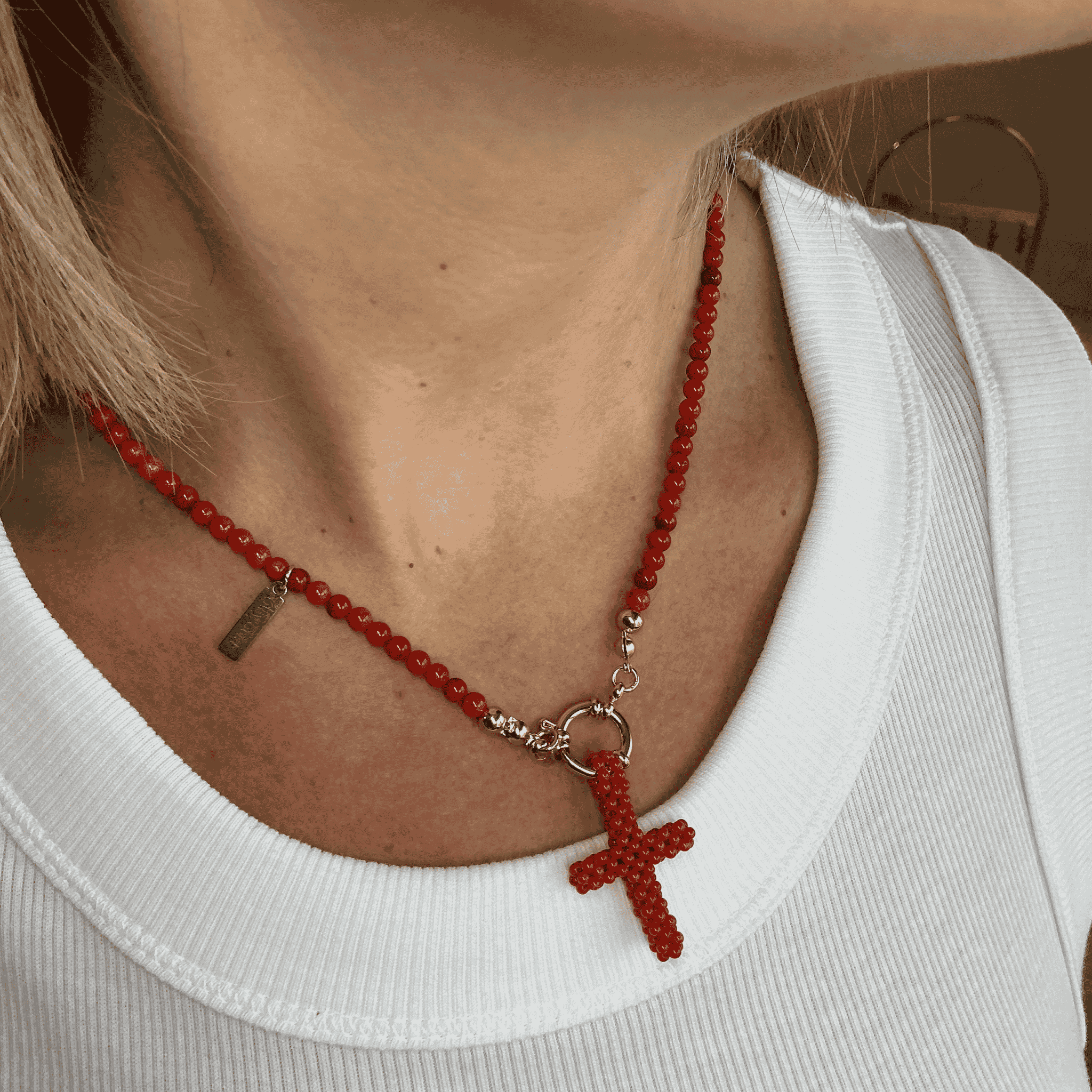 Collar artesanal con cruz de cuentas rojas y cuentas a juego. Elegante, simbólico y duradero gracias a su cierre de acero inoxidable.