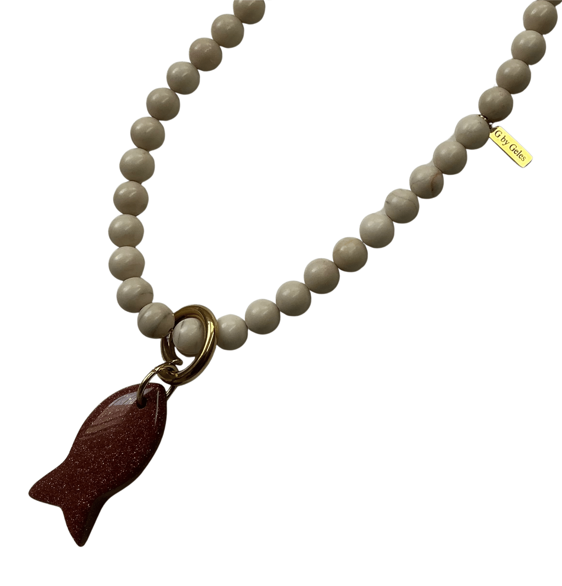 Collar artesanal con colgante de pez en piedra jaspe beige. Una joya única que conecta con la fuerza del mar y el equilibrio natural.