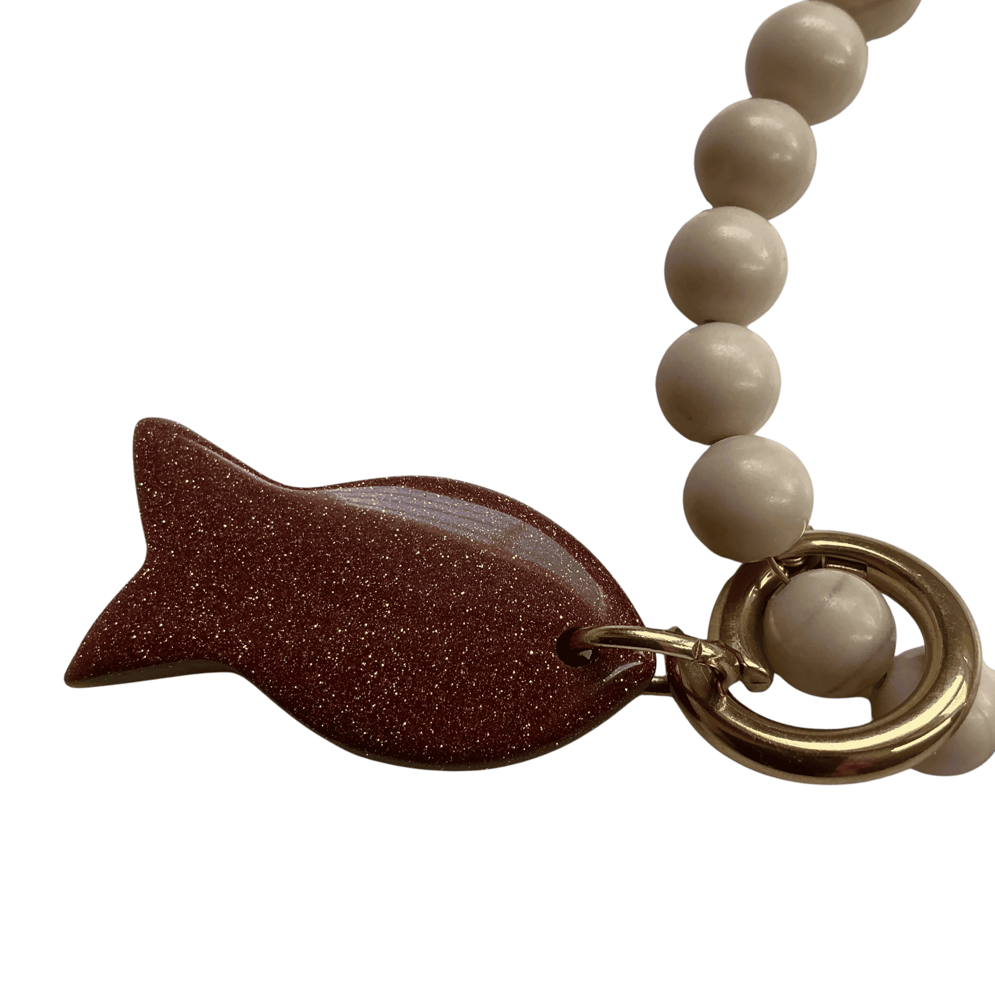 Collar Espíritu Marino con Pez de Jaspe Beige es una pieza artesanal que une la serenidad de la piedra natural con el simbolismo del pez como fuerza de vida y libertad.