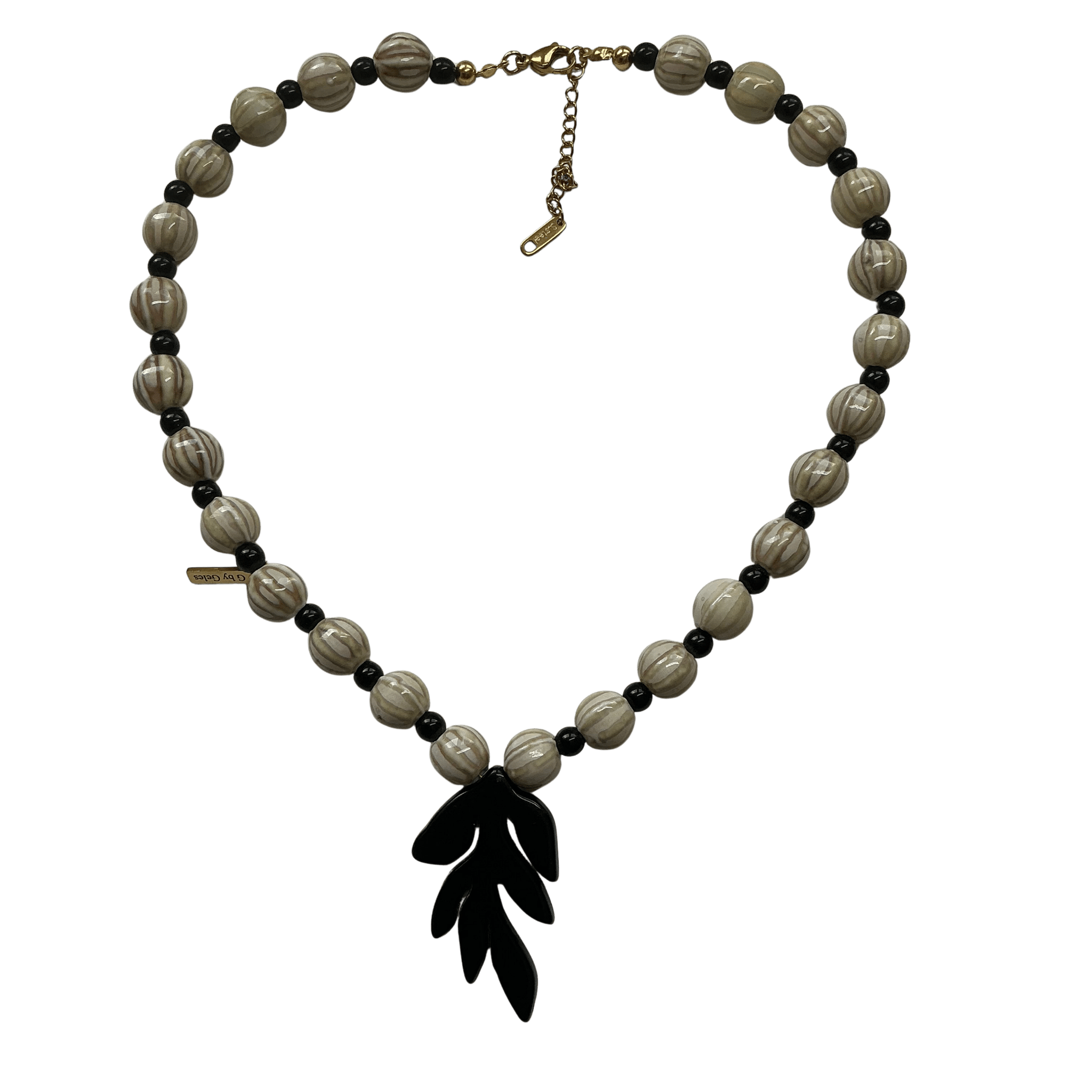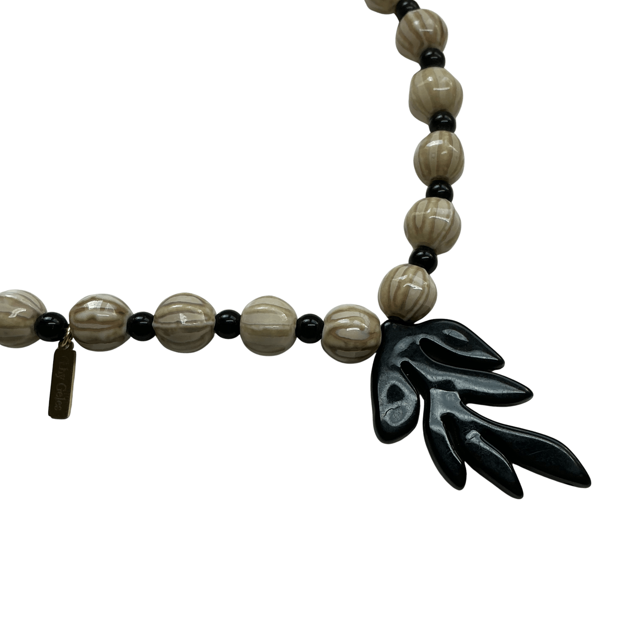 Collar artesanal con cuentas de cerámica y colgante de hoja negra. Sofisticado y versátil, perfecto para looks modernos y elegantes.