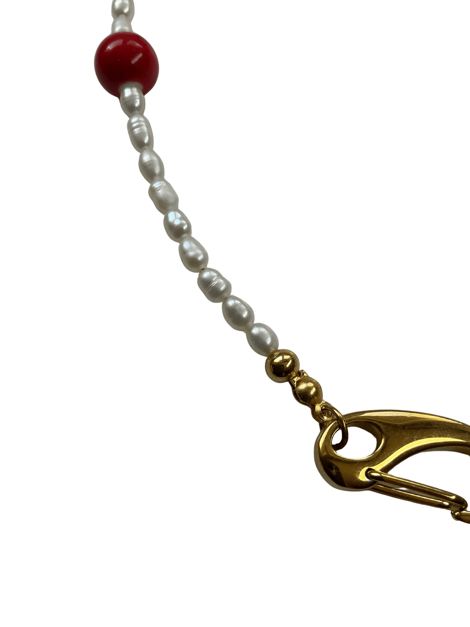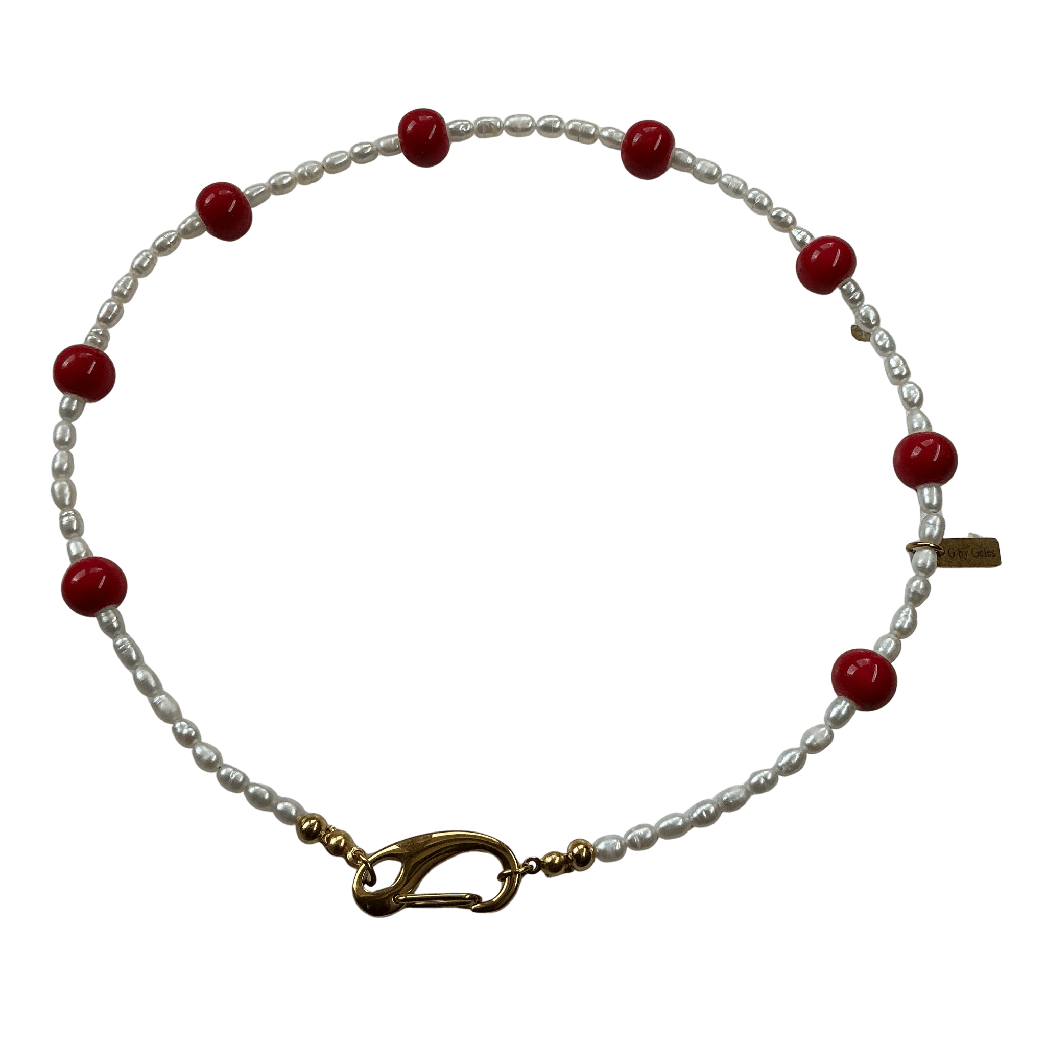 Collar artesanal con perlas de agua dulce naturales y cuentas rojas. Un diseño elegante y ligero, pensado como complemento versátil o regalo especial.